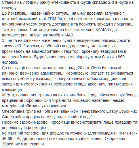 К эвакуации населения привлечены более 20 автобусов Ичнянской РГА Черниговской области. Жертв, раненых, травмированных и погибших среди военнослужащих, работников ВСУ и местного населения нет, материальный ущерб - уточняются.