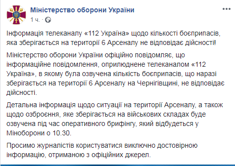 "Министерство обороны Украины официально сообщает, что информация, в которой было озвучено количество боеприпасов, хранящееся в настоящее время на территории 6-го арсенала на Черниговщине, не соответствует действительности", - сказано в сообщении.