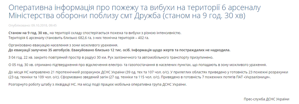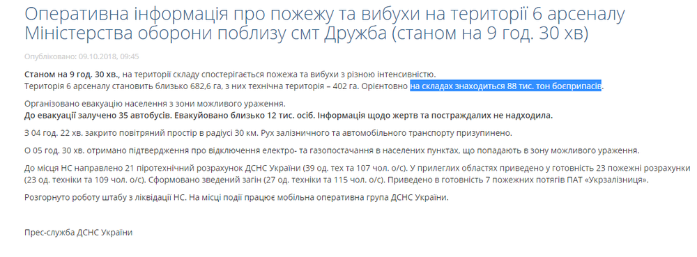 В свою очередь, на сайте Управления ГСЧС в Черниговской области по состоянию на 11:15 есть сообщение о том, что на складах 6-го арсенала под Ичней находится около 88 000 тонн боеприпасов.