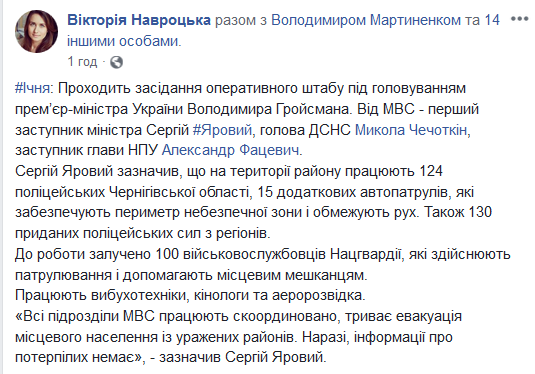 Сегодня, 9 октября, проходит заседание оперативного штаба под председательством премьер-министра Украины Владимир Гройсмана по факту взрывов арсенала №6 в Черниговской области. Об этом сообщает спикер МВД Украины Виктория Навроцкая в Facebook.