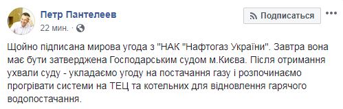 Сегодня, 9 октября, "Нафтогаз Украины" и коммунальное предприятие "Киевтеплоэнерго" подписали мировое соглашение. Завтра оно будет утверждено в Хозяйственном суде Киева. Об этом на своей странице в Facebook сообщил заместитель главы Киевской городской государственной администрации Петр Пантелеев.