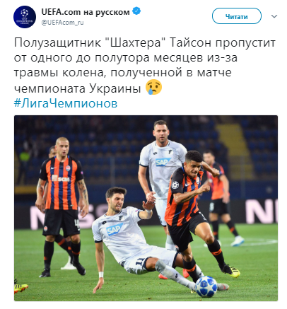 Полузащитник "Шахтера" и капитан команды Тайсон не сможет выйти на поле в качестве игрока в период от одного до полутора месяцев из-за травмы колена,которую он получил в матче чемпионата Украины. Об этом в своем микроблоге в Тwitter сообщает УЕФА.