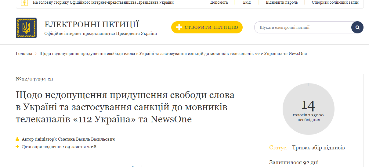 9 октября на сайте президента Украины появилась петиция №22/047294-еп "Относительно недопущения подавления свободы слова в Украине и применения санкций к вещателям телеканалов "112 Украина" и NewsOne".