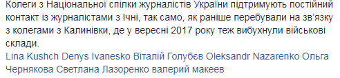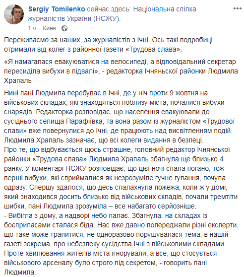 "Коллеги из Национального союза журналистов Украины поддерживают постоянный контакт с журналистами из Ични, так же, как ранее находились на связи с коллегами из Калиновки, где в сентябре 2017 тоже взорвались военные склады", - отметил Сергей Томиленко.