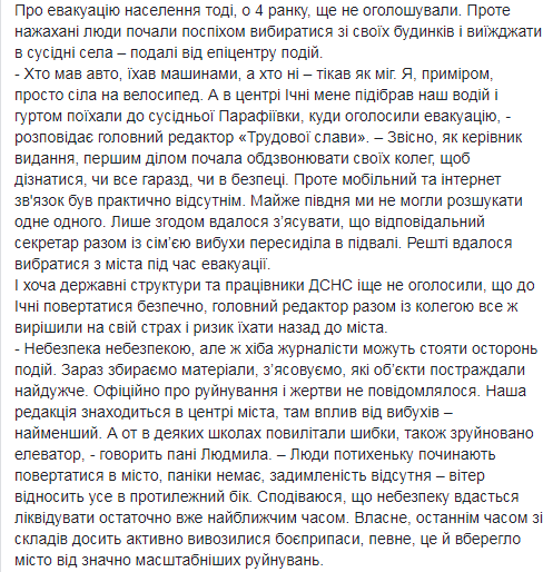 "Почти полдня мы не могли разыскать друг друга. Лишь впоследствии удалось выяснить, что ответственный секретарь вместе с семьей взрывы просидела в подвале. Остальным удалось выбраться из города во время эвакуации. И хотя государственные структуры и работники ГСЧС еще не огласили, что в Ичне возвращаться безопасно, главный редактор вместе с коллегой все же решили на свой страх и риск ехать обратно в город. - Опасность опасностью, но разве журналисты могут стоять в стороне от событий", - сообщила главред "Трудовой славы".