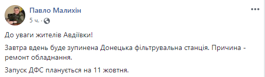 "Вниманию жителей Авдеевки. Завтра днем будет остановлена Донецкая фильтровальная станция. Причина – ремонт оборудования", - написал он на своей странице в Facebook.