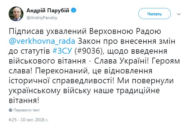Спикер парламента Андрей Парубий сегодня, 10 октября, подписал закон о введении нового приветствия в украинской армии "Слава Украине".