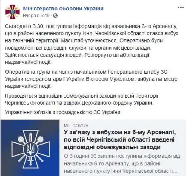 - В 05:49 Минобороны на своей странице в Facebook сообщает о пожаре на арсенале. Никаких предупреждений на радио или государственных каналах нет.