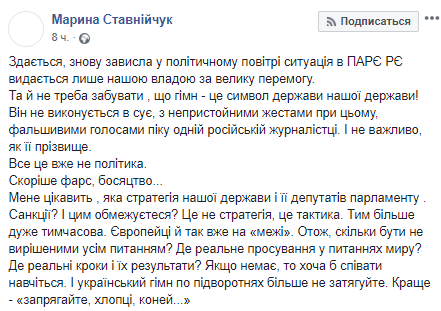 "Кажется, опять зависшая в политическом воздухе ситуация в ПАСЕ СЕ выдается только нашей властью за большую победу. Да и не надо забывать, что гимн - это символ государства, нашего государства! Он не выполняется в суе, с непристойными жестами при этом, фальшивыми голосами в пику одной российской журналистке. И не важно, как ее фамилия. Все это уже не политика. Скорее фарс, босяцтво...