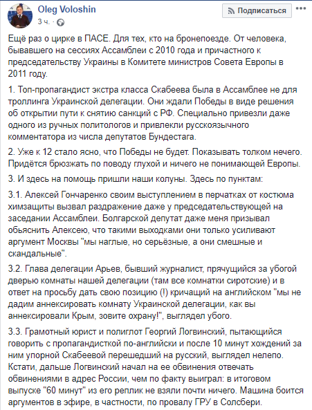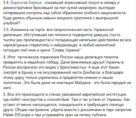 "1. Топ-пропагандист экстра класса Скабеева (журналистка "России 1", которая была на видео Гончаренко - Прим.Ред.) была в Ассамблея не для троллинга Украинской делегации. Они ждали Победы в виде решения об открытии пути к снятие санкций с РФ. Специально привезли даже одного из ручных политологов и привлекли русскоязычного комментатора из числа депутатов Бундестага.
