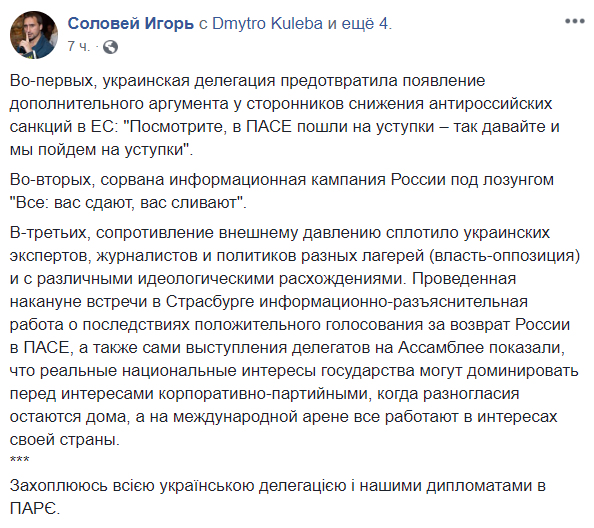 "Во-первых, украинская делегация предотвратила появление дополнительного аргумента у сторонников снижения антироссийских санкций в ЕС: "Посмотрите, в ПАСЕ пошли на уступки – так давайте и мы пойдем на уступки".