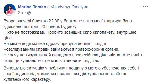 Она отмечает, что не хочет связывать это случай с профессиональной деятельностью. "Выношу эту ситуацию в публичную плоскость с целью обеспечения безопасности себя и своей семьи от возможных дальнейших действий хулиганского либо не хулиганского характера", – добавила Томко, опубликовав фото оконного стекла с отверстием от выстрела.