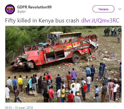 В Кении 50 человек погибли в ночь на 10 октября в результате потери водителем автобуса контроля над дорогой. Во время аварии транспортному средству полностью снесло крышу.
