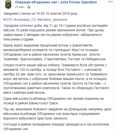 Всего в течение суток 10 октября, с 7:00 до 18:00 сепаратисты 10 раз нарушили режим прекращения огня. При этом зафиксировано два случая применения вооружения, запрещенного минскими соглашениями.