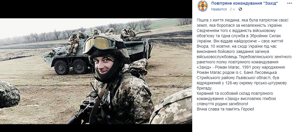 Стали известны имена двух бойцов, погибших 10 октября на Донбассе. Это 27-летний Роман Магас из Львовской области и 20-летний Сергей Дронов из Чигирина Черкасской области. Бойцы подорвались на взрывном устройстве. Об этом сообщается на сайте Львовской ОГА.