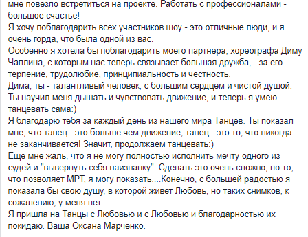 Она поблагодарила всех, кто за нее болел, семью и всех, кто делает шоу. И отдельно своего партнера по танцам Дмитрия Чаплина. К посту Оксана Марченко приложила флюорографию ребер и медицинские справки, подтверждающие перелом двух ребер. А также фото с Дмитрием Чаплиным.
