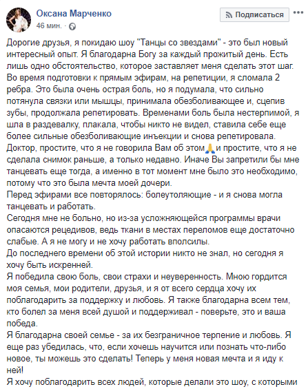 В четверг, 11 октября, популярная телеведущая Оксана Марченко внезапно заявила об уходе из шоу "Танцы со звездами" 2018.