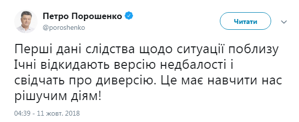 Президент Украины Петр Порошенко заявил, что первые данные следствия по делу о пожаре на складе боеприпасов в Ичне свидетельствуют о диверсии. Об этом говорится в твиттер-микроблоге президента Украины.