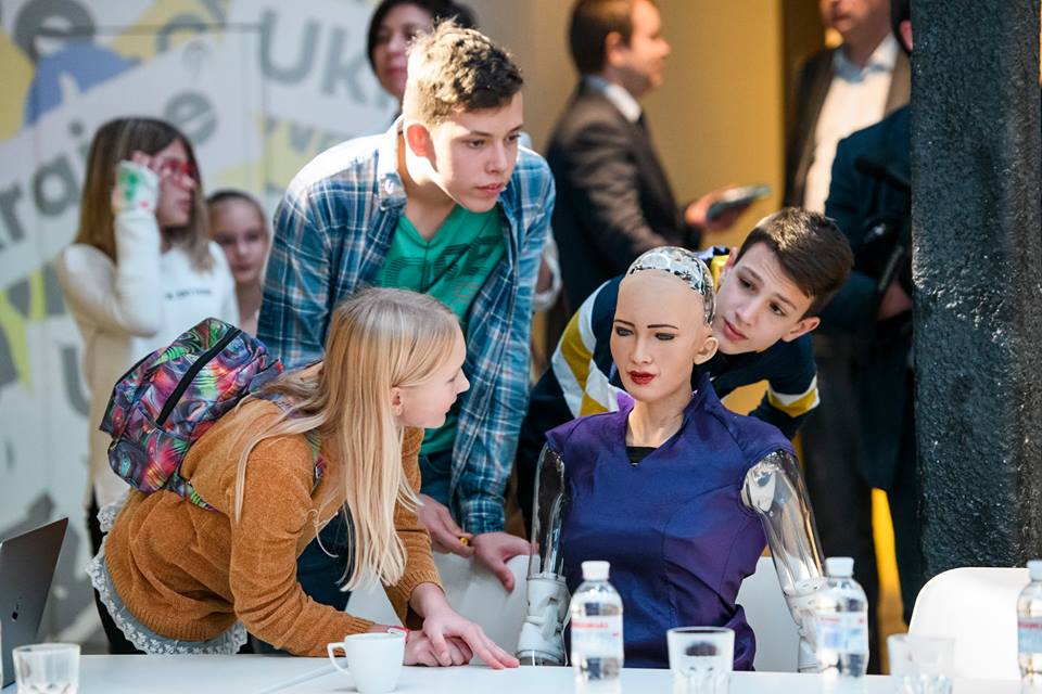 Робот София находится с "официальным визитом" в Украине - ее привезли для подписания Меморандума о сотрудничестве между Государственным агентством по вопросам электронного правительства Украины и компаниями Hanson Robotics и AngelVest для развития искусственного интеллекта в Украине.