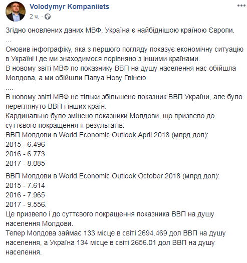 "В новом отчете МВФ по показателю ВВП на душу населения Молдова нас обошла, а мы обошли Папуа Новую Гвинею", - сообщил он.