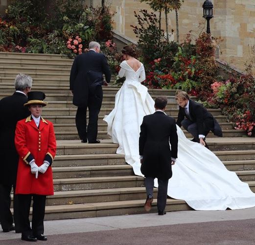 К алтарю принцесса Евгения пошла счастливо улыбаясь. За музыкальное сопровождение во время церемонии в часовне Святого Георгия отвечал Королевский филармонический оркестр под управлением Джеймса Уильямса и приглашенный почетный гость, легендарный итальянский певец Андреа Бочелли.