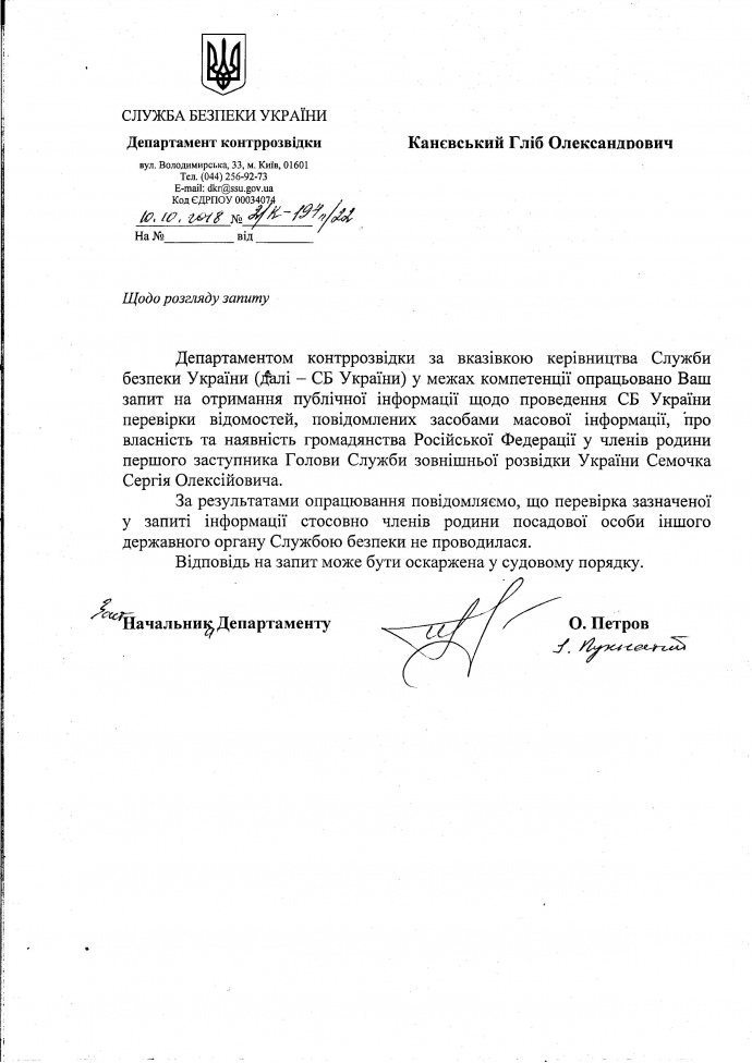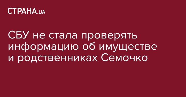 СБУ не проводила проверку обнародованной журналистами информации о том, что первый заместитель председателя СВР Сергей Семочко имеет дорогую недвижимость, а его родственники - российское гражданство. Об этом со ссылкой на данные главы экспертной организации StateWatch Глеба Каневского пишет "Украинская Правда".
