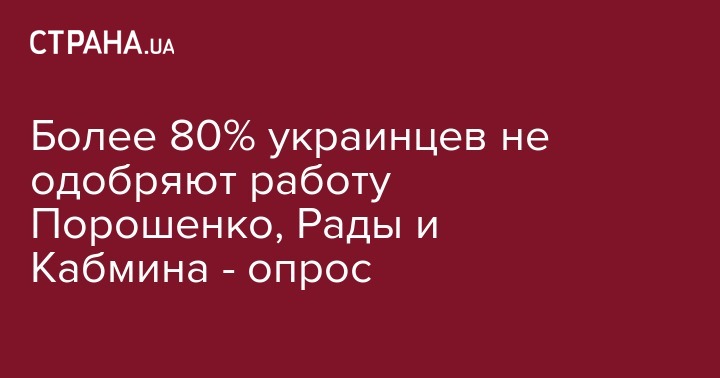 Подавляющее большинство участников соцопроса в Украине (79,4%) не одобряют роботу президента Украины. Чуть более недовольны Кабинетом Министров (84,1%) и Верховной Радой (88,2%).