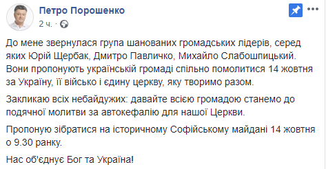"Ко мне обратилась группа уважаемых общественных лидеров, среди которых Юрий Щербак, Дмитрий Павлычко, Михаил Слабошпицкий. Они предлагают украинскому обществу совместно помолиться 14 октября за Украину, ее войско и единую церковь, которую творим вместе.