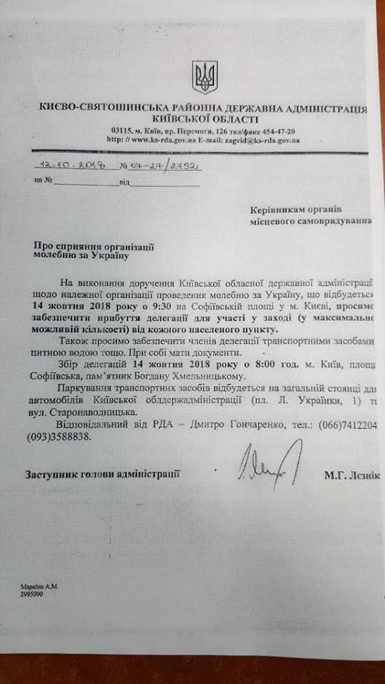 В распоряжении "Страны" оказался документ, согласно которому Киево-Святошинская районная администрация столицы предписала руководителям органов местного самоуправления предоставить людей для участия в мероприятии "в максимально возможном количестве" от каждого населенного пункта. Сбор намечен на 8 утра 14 октября на Софийской площади у памятника Богдану Хмельницкому.
