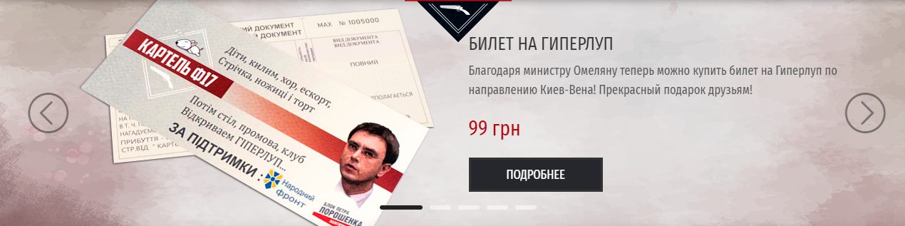 Там также можно приобрести монету "зрада/перемога" по цене 399 грн, билент на Гиперлуп - 99 грн, книгу о президенте Петре Порошенко "Петр Пятый" авторства Александра Онищенко - 400 грн и прочее.