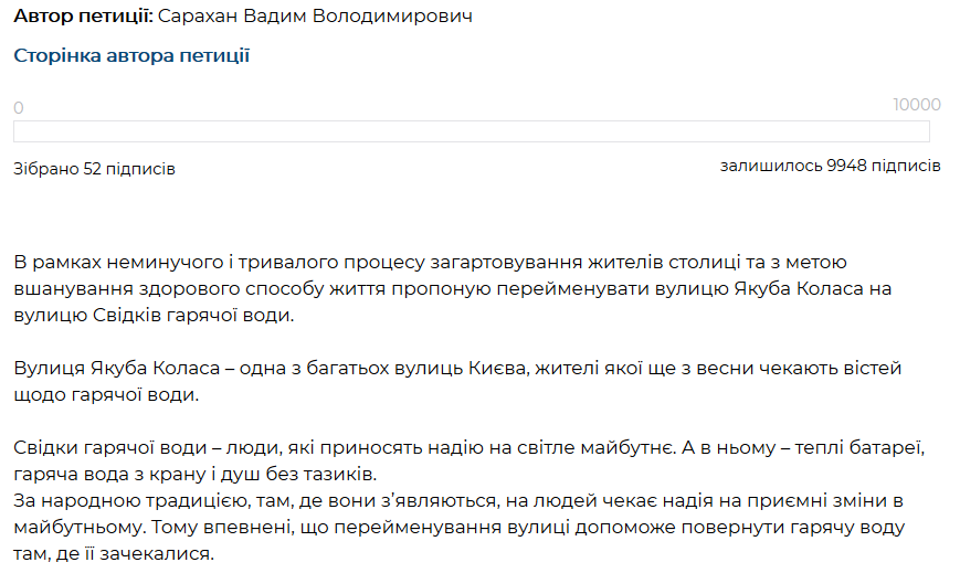 Автор предлагает переименовать улицу Якуба Коласа, это одна из многих улиц Киева, жители которой еще с весны ждут вестей о горячей воде. "Свидетели горячей воды - люди, которые приносят надежду на светлое будущее. А в нем - теплые батареи, горячая вода из крана и душ без тазиков", - объясняет автор петиции.
