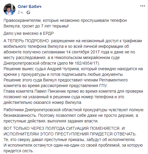 По информации Олега Бабича, на сегодняшний день в Единый реестр досудебных расследований внесено дело о незаконной прослушке телефона Вилкула, а правоохранителям, которые ее осуществляли, грозит до 7 лет тюрьмы.