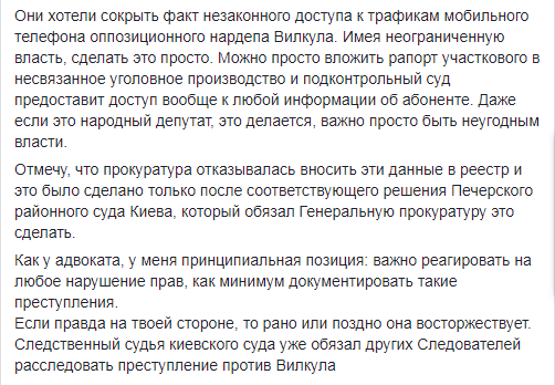 В частности, адвокат утверждает, что разрешение на незаконный доступ к трафикам мобильного телефона Вилкула и ко всей личной информации об абоненте было получено силовиками 14 сентября 2017 года и даже не по месту расследования, а в Никопольском межрайонном суде Днепропетровской области (дело № 182/4954/17). Кроме того, оно было выдано без разрешения парламента. Информация вскрылась во время заседания Регламентного комитета Рады 8 октября.