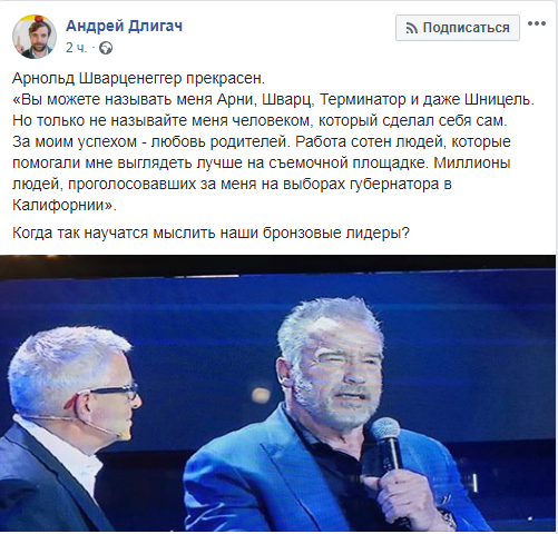 Кроме того, на самом форуме он рассказал о причинах своего успеха. "Вы можете называть меня Арни, Шварц, Терминатор и даже Шницель. Но только не называйте меня человеком, который сделал себя сам. За моим успехом - любовь родителей. Работа сотен людей, которые помогали мне выглядеть лучше на съемочной площадке. Миллионы людей, проголосовавших за меня на выборах губернатора в Калифорнии", - цитирует его в Facebook Андрей Длигач.