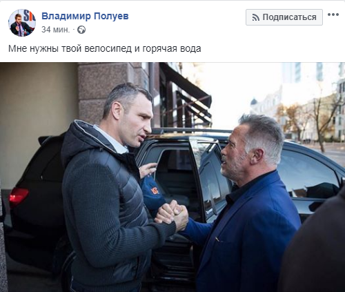 В сети прибытие "железного Арни" вызвало фурор. Активнее всего пользователи Facebook отреагировали на снимок, на котором Шварценеггер пожимает руку Кличко. Пользователи пофантазировали на тему, какой могла бы быть подпись к снимку и что обсуждали мужчины.