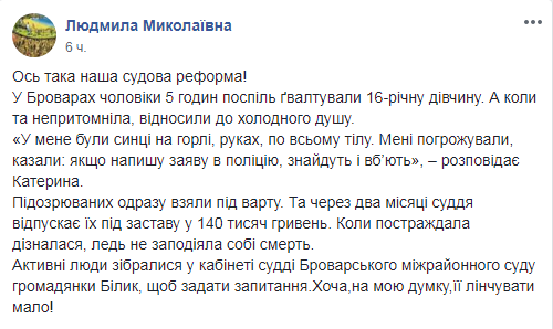 Броварской межрайонный суд освободил мужчин, которые в августе на протяжении пяти часов насиловали 16-летнюю девушку, под залог в 140 тысяч гривен. Такое решение вынесла судья Билык. Об этом сообщает в Facebook пользователь сети Людмила Николаевна.