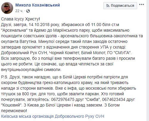 "Собираемся в 11:00 у ст.м. "Арсенальная" и идем в Мариинский парк, чтобы максимально повредить советских идолов - арсенальского большевика-мятежника и оккупанта Ватутина. В прошлую среду такой план мероприятий окончательно утвердил оргкомитет по празднованию дня создания УПА в составе: Добровольческого движения ОУН, Черного Комитета, Белого Молото, ОО "Смуга". Всех приглашаю, потому что из полиции уже звонили много раз и просили этого не делать. Это означает, что власть цепляется за свои внутренне оккупационные символы", - сообщил он.