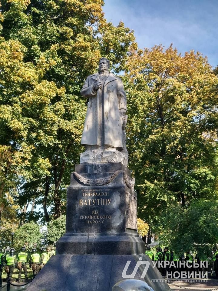 Сегодня, 14 октября, националисты из ОУН планировали снести памятник генералу Николаю Ватутину, который освобождал Киев от фашистов в 1943 году. Однако, в Мариинском парке, полиция взяла монумент в оцепление и не позволила радикалам осуществить свои планы.