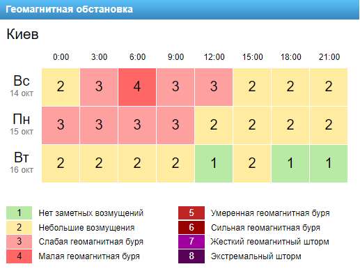 Геомагнитная обстановка в Украине 15 октября будет беспокойной. Утром прогнозируют слабую геомагнитную бурю, после 9:00 и до конца суток будут происходить небольшие возмущения.