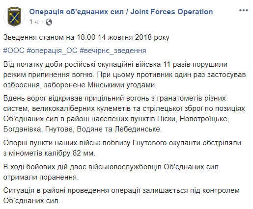 Сегодня, 14 октября, двое украинских военнослужащих получили ранения в ходе боевых действий на Донбассе. Об этом сообщается на странице Операции объединенных сил в соцсети Facebook.