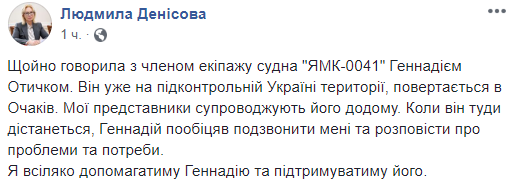 Украинский рыбак Геннадий Отычко с задержанного вблизи оккупированного Крыма судна ЯМК-0041, покинул аннексированный полуостров и прибыл на материковую Украину. Он направляется в Очаков Николаевской области на похороны матери. Об этом сообщила украинский омбудсмен Людмила Денисова на своей странице в Facebook.
