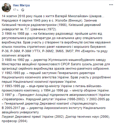 На 74-м году жизни скончался Валерий Шмаров - доктор технических наук, профессор, бывший министр обороны Украины и экс-директор Аэрокосмического института Национального авиационного университета.