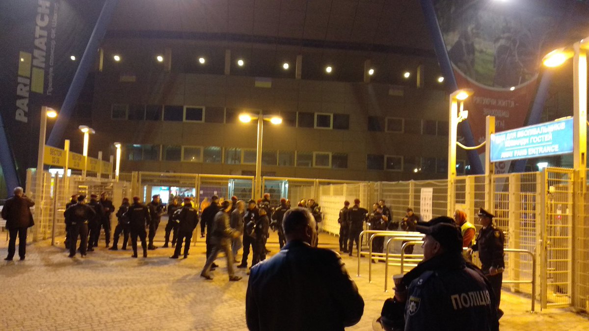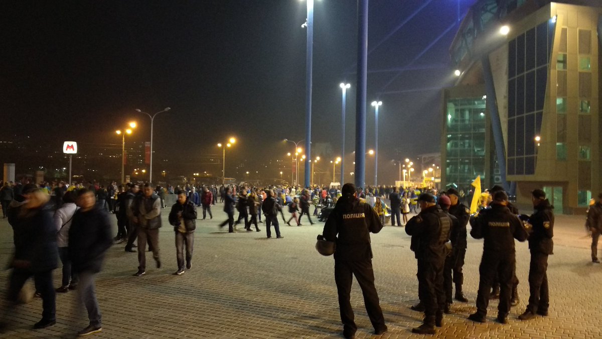 21:02 У входов на стадион "Металлист" в Харькове уже многолюдно.