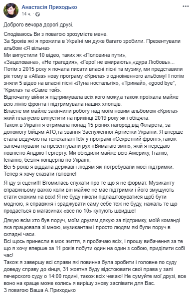 "... я прощаю всех, и прошу прощения за то, что я хочу впервые за 11 лет побыть один на один с собой, уделить себе время! Также я завершу все дела которые должна была сделать и главное по суду доведу дело до конца, 31 октября буду отстаивать свои права в зале Печерского суда в 14:00 часов, также всех жду! Не унывайте мои друзья, все это к лучшему может когда-то я решу снова спеть для Вас. Ваша А. Приходько", - написала певица.