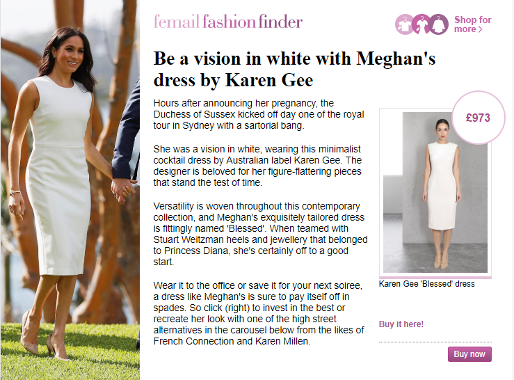 Также в СМИ сообщают, что поклонники Меган Маркл обвалили сайт австралийского бренда Карен Джи, как только герцогиня Сассекская выбрала белое платье этого дизайнера стоимостью 1800 долларов. Посетители в очередной раз показали "эффект герцогини": все наряды, в которых появляются Меган Маркл и Кейт Миддлтон, мгновенно раскупают.