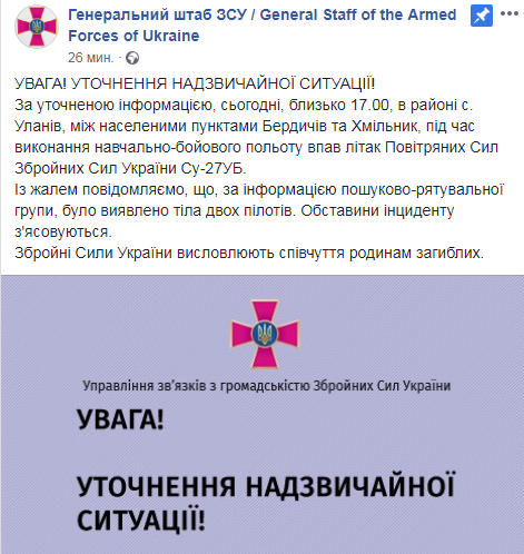 "С сожалением сообщаем, что, по информации поисково-спасательной группы, были обнаружены тела двух пилотов. Обстоятельства инцидента выясняются", - говорится в обновленной заметке на странице Генштаба ВСУ в соцсети Facebook. Примерное время редактирования - 18:35.