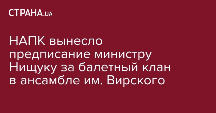 Национальное агентство по предупреждению коррупции (НАПК) вынесло предписание министру культуры Евгению Нищуку за то, что он не предотвратил конфликт интересов художественного руководителя ансамбля танца имени Вирского Мирослава Вантуха. Такое решение НАПК приняло на заседании 17 октября, говорится на сайте ведомства.