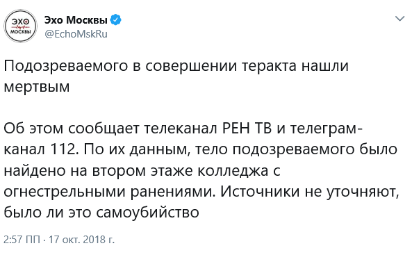 Подозреваемого в совершении теракта в политехническом колледже Керчи могли найти мертвым Об этом сообщает "Эхо Москвы" в Twitter.