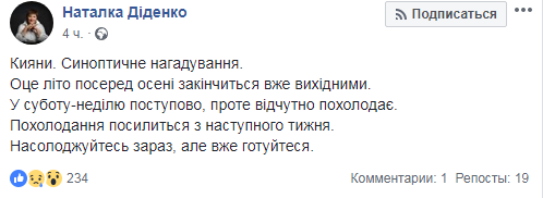 "Киевляне. Синоптических напоминания. Это лето посреди осени закончится уже в выходные. В субботу-воскресенье (20-21 октября - Прим. ред.) постепенно, однако ощутимо похолодает. Похолодание усилится со следующей недели.