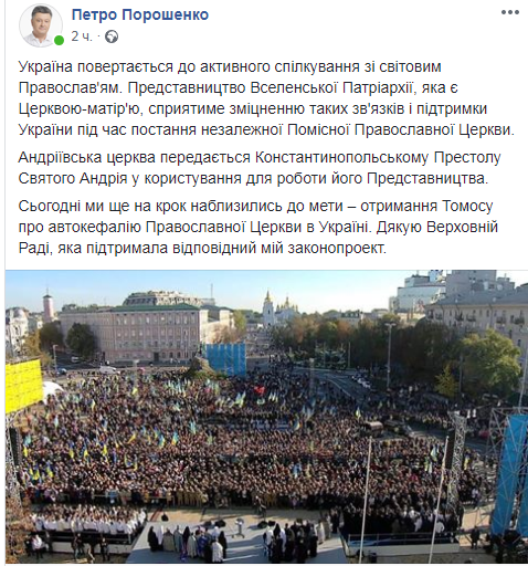 Решение парламента, естественно, одобрил президент Петр Порошенко. В своем Facebook он поблагодарил депутатов и заявил, что "возвращение Украины к активному общению с мировым православием". Кроме того, Порошенко подчеркнул, что соответствующий законопроект подготовил он.